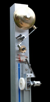 A small motor on a slide moves up to the top of the slide, causes a receptionists bell to make a delicate ding, waits a couple of seconds and then goes down to the bottom. It waits at the bottom for a couple of seconds and then goes up to the top again. This is a continuous process. It takes about four minutes to complete the cycle.