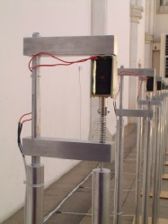 This sound-sculpture installation has eight individual pieces controlled by a single micro-controller. Each piece uses a solenoid (electro-magnet) to lift an aluminium tube and then drop it onto a Maple wood base causing a percussive sound. Each piece is controlled by its own random electronic circuit with variable probability of operating or not. The time signature is 4:4 and the probabilities of the solenoids operating are varied according to the particular beat of the bar. The result is a kind of rhythmic clatter which is random rather than just being predetermined. There are two PIR (movement detectors) sensors mounted on the wall behind the installation. The work only does anything if someone moves in front of it.